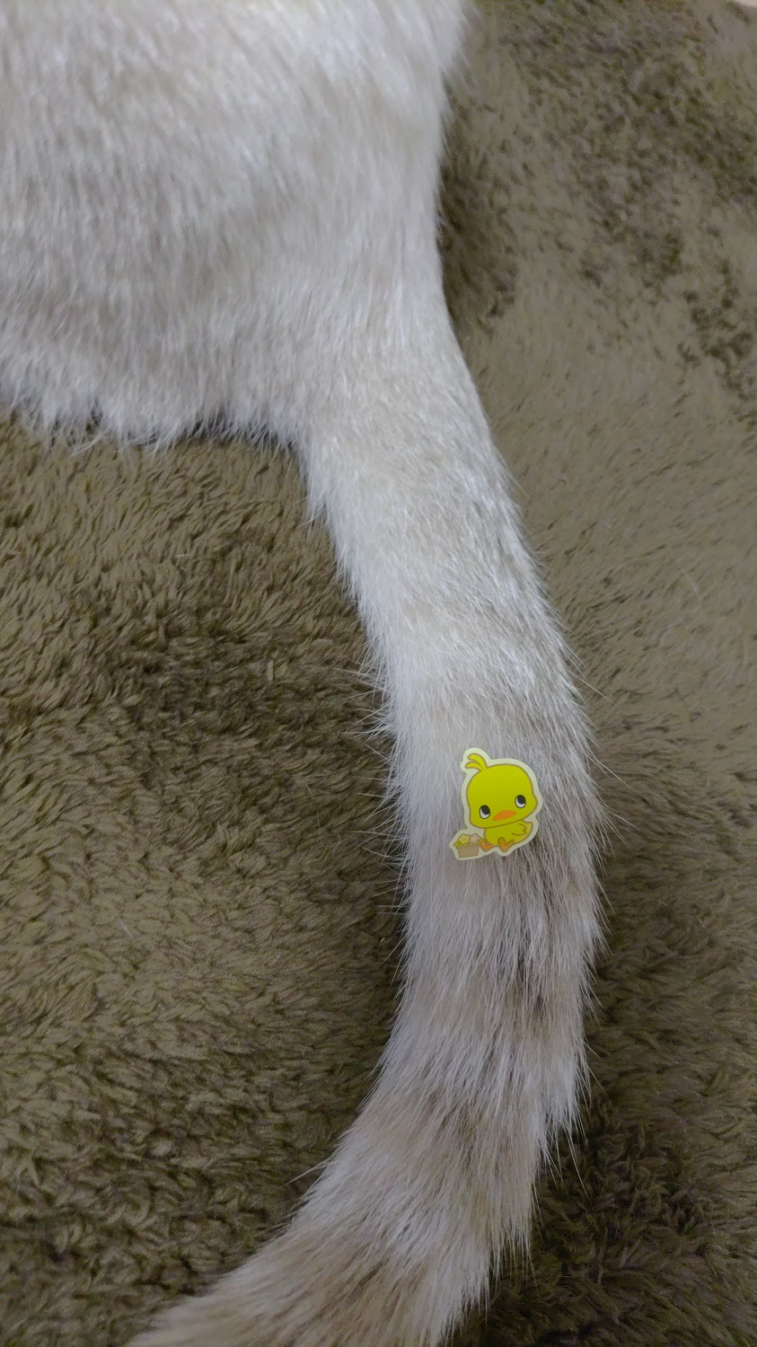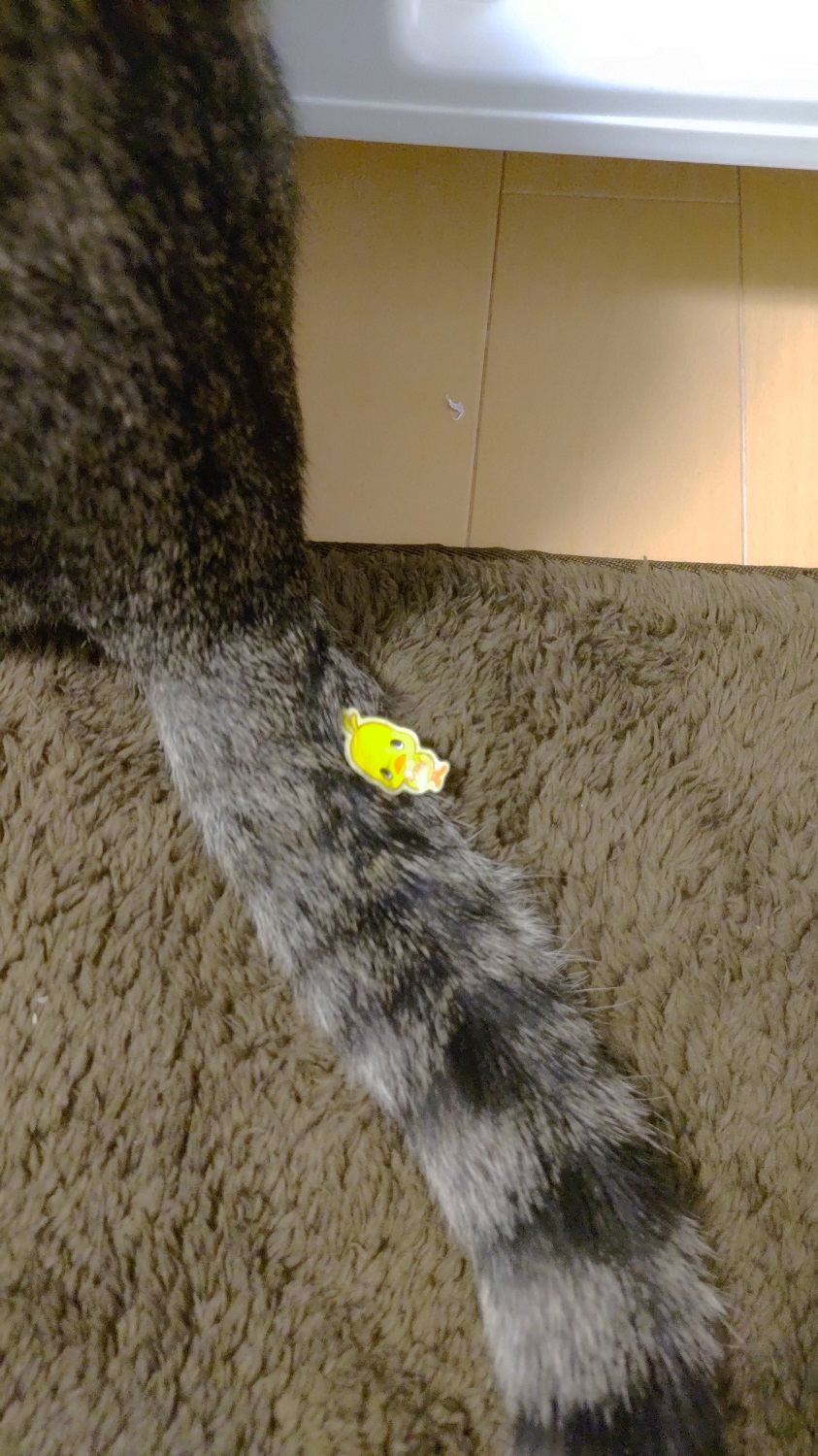 前に何かで貰ったチキンラーメンのシールを置いておいたらふたりが遊んでいたので、いたずらして貼ってみた。意外に気付かず、しばらく貼ったまま遊んでいた。