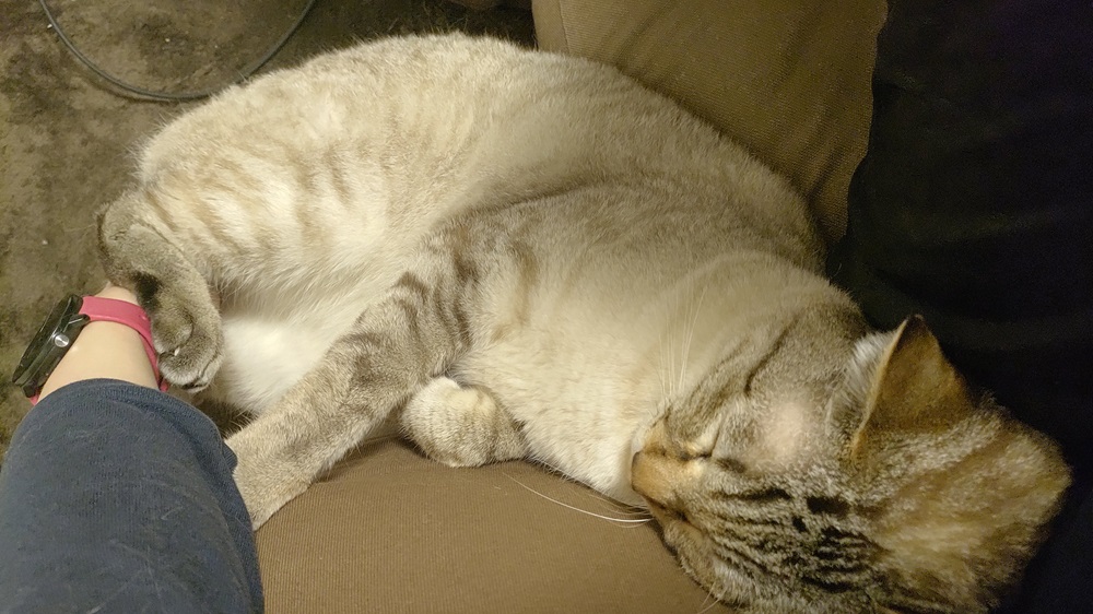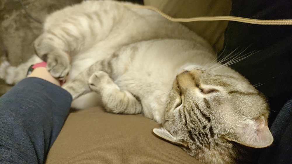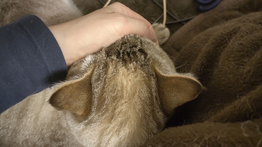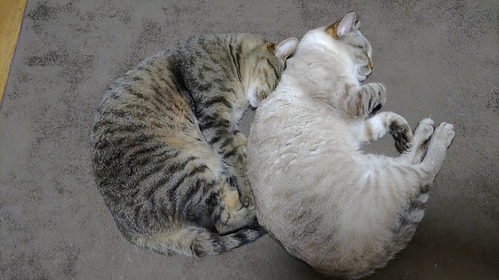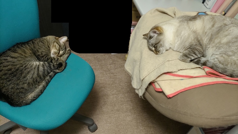 これは、両手それぞれの上でふたりが寝始めて作業できない様を何とか写真に撮ろうとしたところ