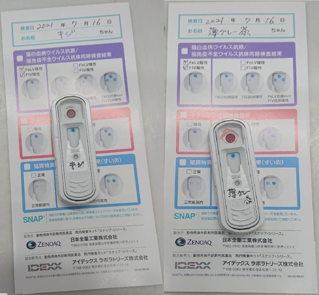 7月中旬に、ふたりのワクチン1回目とエイズ白血病検査が行われたとのことで、譲渡主さんが結果を送ってくださった。